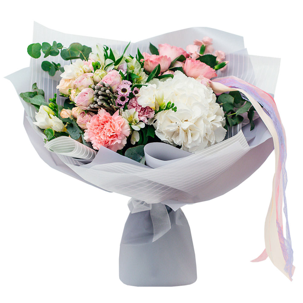 На фото представлен образец. Объем букета зависит от выбранного вами размера. Точное количество цветов и цветовую гамму вы можете уточнить у менеджера по телефону.